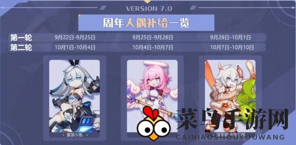 从9月22日12:00至10月10日12:00,游戏还将推出六期人偶补给活动。武装人偶「重装小兔」、「妖精爱莉」、「琪亚娜·卡斯兰娜」将依次开启补给,获取概率将提升!