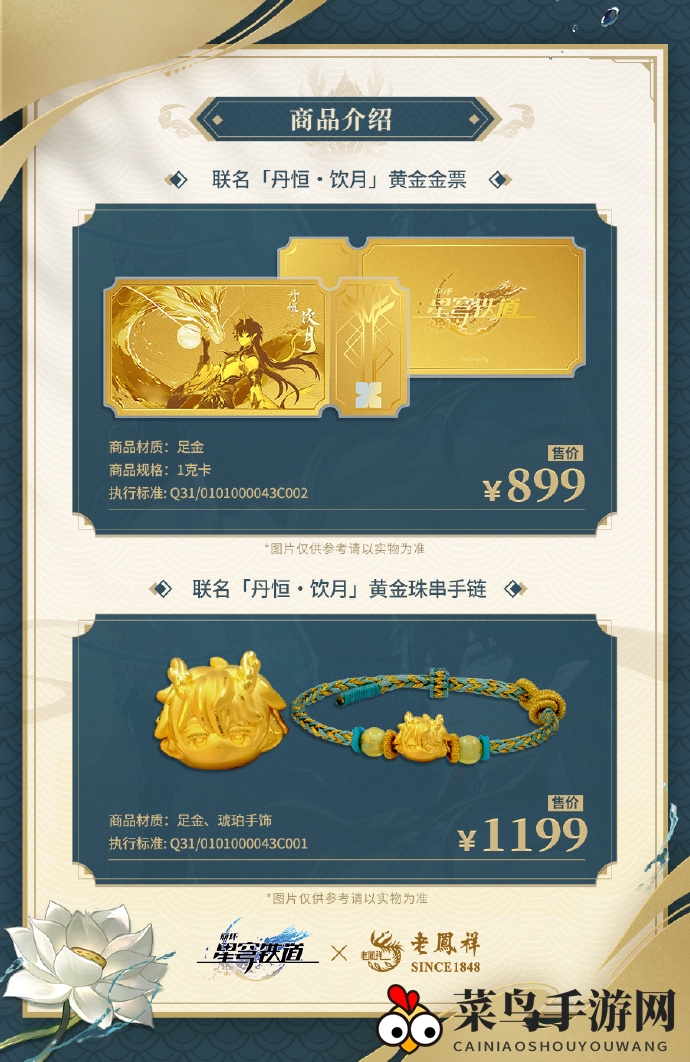联名款「丹恒?饮月」黄金金票,纯金999,单克重1克;联名「丹恒?饮月」黄金串珠手链,同样纯金999,单克重约1.15克。两款金品一口价,玩家们可按需理性购买。