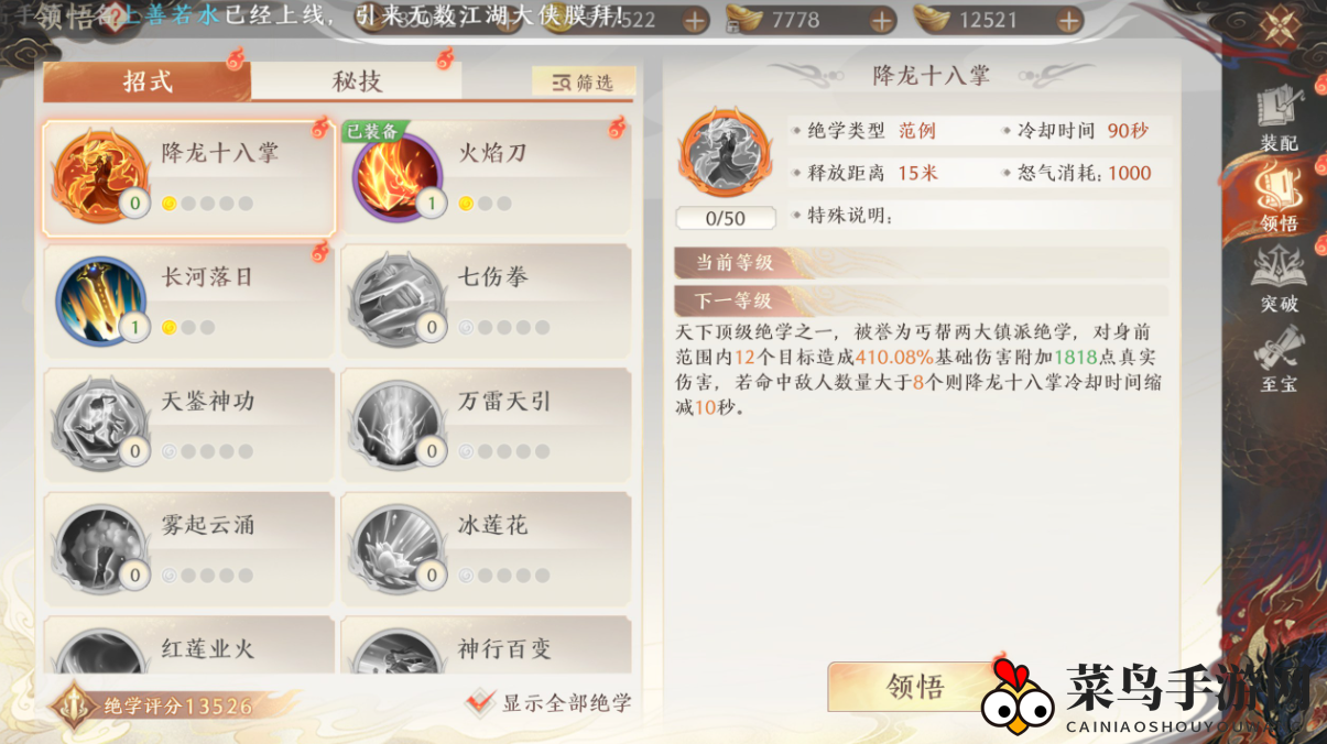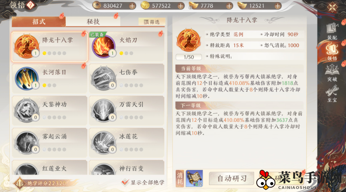利用自动修炼功能,玩家能迅速提升绝学等级,并提前预览下一等级绝学的强大效果。