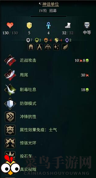 剧毒吐息:攻击3框格锥形内的所有单位,投石车破坏加固障碍。中毒,有60%的基础概率施加中毒,持续3回合,倒计时2,魔法。