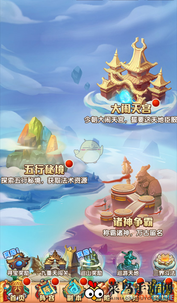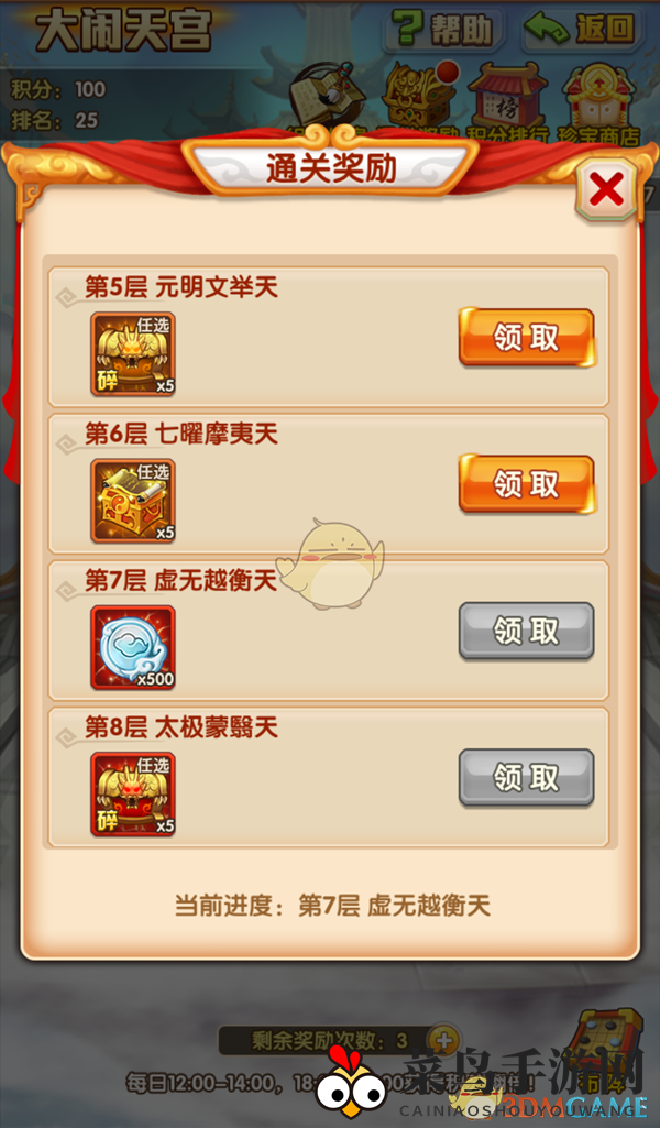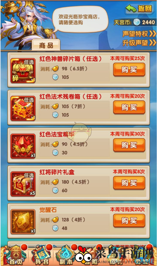 挑战大闹天宫,你将获得天宫币,这些币可以在“珍宝阁”中以优惠价格兑换红色神兽、红色法术书等珍稀资源。