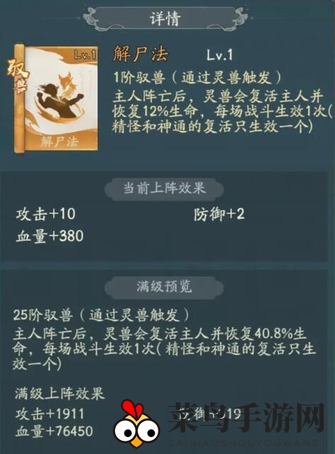 驭兽:尸解法。复活保命,死亡也可触发勾陈效果,死后可快速回血并再次闪避。