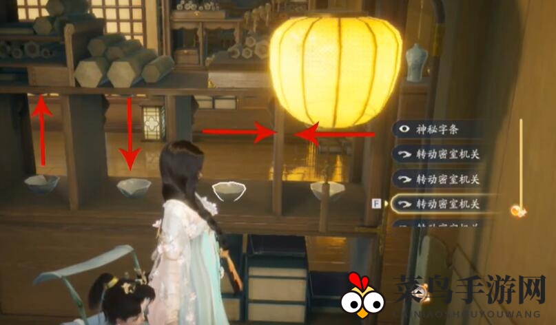 沿着楼梯攀登至三楼,细致观察“前、后、右、左”碗的缺口,巧妙转动,开启通往密室的神秘之门。