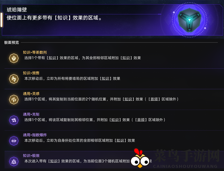 1、与「倒计时」玩法相似,玩家需借助骰子让大部分区域附着【知识】效果。但「琥珀障壁」仅在进入【首领】、【事件异常】或【交易】区域时,方能激活被动的强化效果。