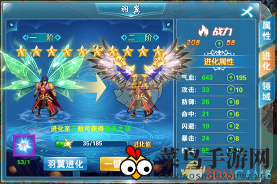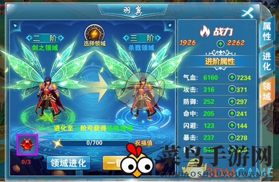 一、翅膀界面三大区域:属性、升级、领域。