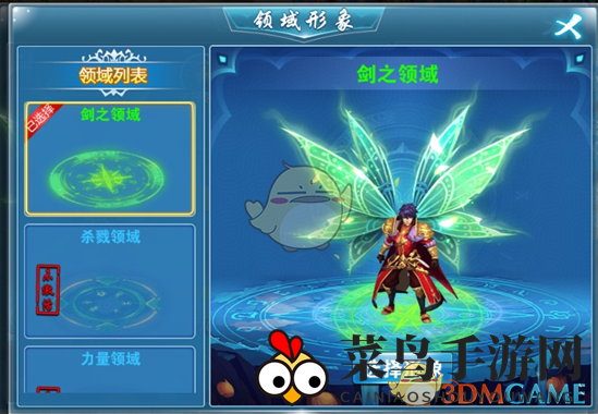 三、领域篇:翅膀领域共有十阶,每阶都有独特的领域形象,以脚下的光阵形式呈现。跨界石提升领域阶数,可在商城购买或参与运营活动获得。界面右侧展示翅膀领域系统的战斗力属性。点击选择领域,可打开选择领域形象的面板。