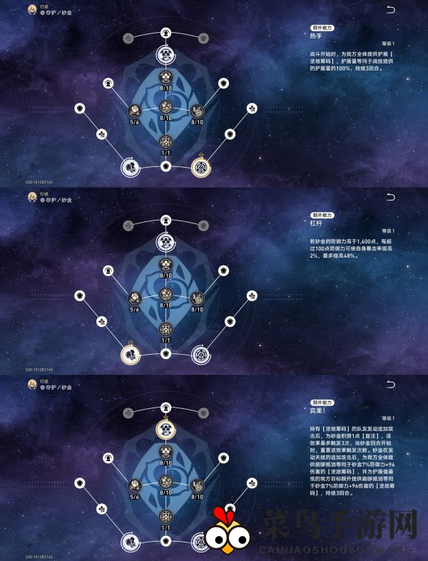 在技能加点上,砂金作为守护型角色,首要任务是保护队友。因此,应优先提升战技等级,其次是天赋,最后是增伤效果的终结技。普通攻击的加点可适当忽略。