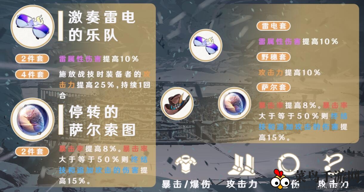 另外,景元的遗器套装还可选择【激奏雷电的乐队】、【野穗伴行额快枪手】和【停转的萨尔索图】的二加二加二组合,作为过渡遗器搭配之选。
