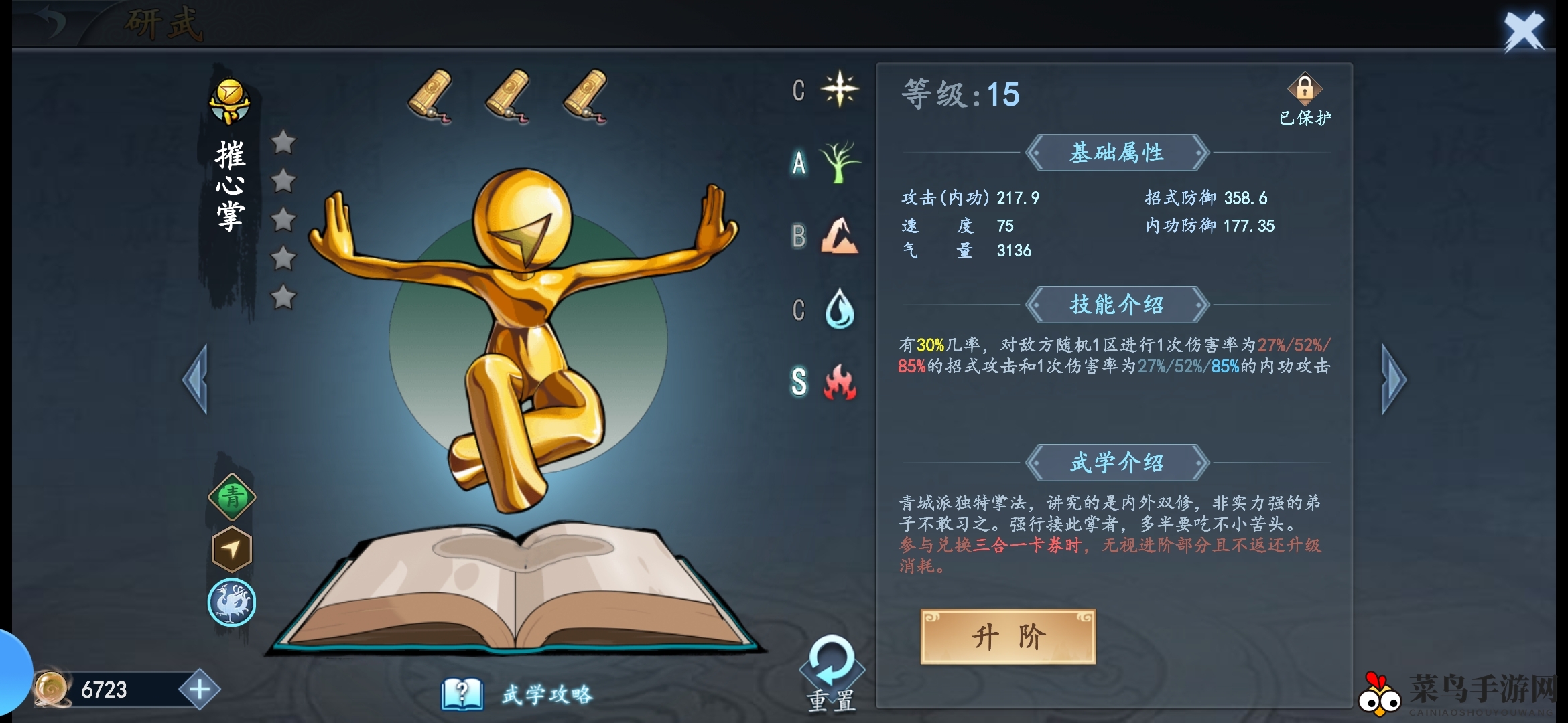 2、财富积累(四式至五式):此阶段,你的目标是积累财富,至少要留出30金币以备不时之需。在升级至五式武学之前,大胆使用金币大量抽取武学,确保金刚掌升至三星,同时关注同路数武学的星级提升,至少达到三星。其他武学保持在二星即可满足初期需求。