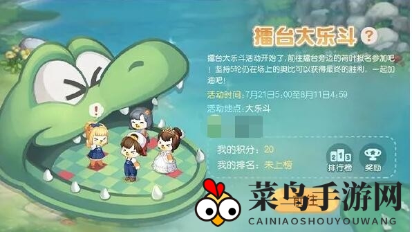 1、报名参加【擂台大乐斗】的地点就在擂台旁的荷叶区域,成功挺过五轮的勇士将荣获荣耀之巅。