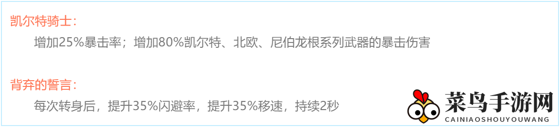 加成25%暴击率,80%凯尔特、北欧、尼伯龙根系列武器的暴击伤害,全面提升伤害输出。