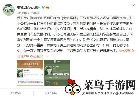 电视剧《女心理师》官方账号对知乎和豆瓣的评分作出了回应,知乎给出了8.9的评分,而豆瓣则是5.1。官方表示:“我们接受各平台给出的评分,打分机制不是我们作为剧方需要考虑的问题。我们坚信,《女心理师》是一部制作精良,演员演技在线且具有时代价值的作品。”
