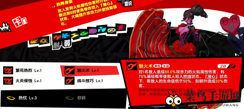 在【技能】方面,高卷杏的1技能可对全体敌人造成巨量火焰伤害并提升攻击力,潜心状态下还能削弱敌方攻击。2技能魅火术则对单个敌人造成高额火焰伤害,并使其有高概率进入燃烧状态,每回合损失5%生命值。三技能火炎侵蚀为群体伤害,对敌人造成大量火焰伤害,并有50%概率使敌人陷入燃烧状态。