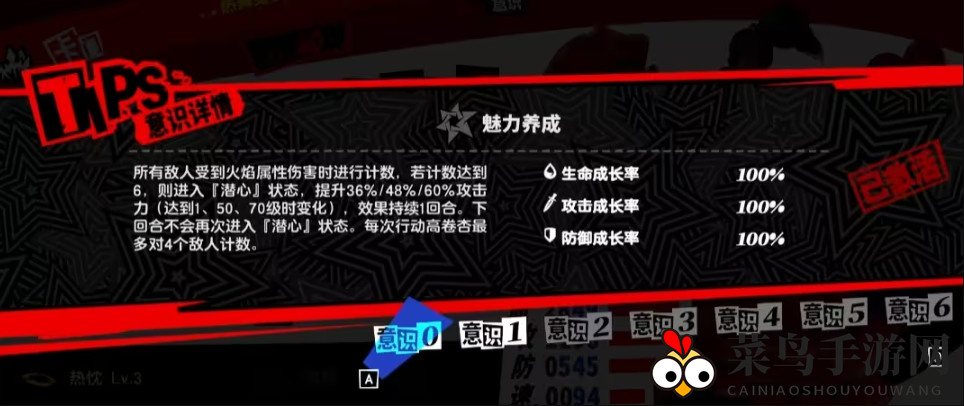 高卷杏的技能机制揭秘:每当敌人受到火焰伤害时,她会在【意识】状态下计数,计数达6后进入潜心状态,攻击力提升,增幅效果随等级增长。