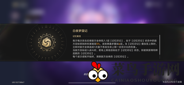 每次攻击后,敌方全体陷入1层【记忆印记】,每层提高5%伤害,最多叠加6层(30%伤害提升),满层后造成生命上限百分比伤害,新伦次后重新计算。