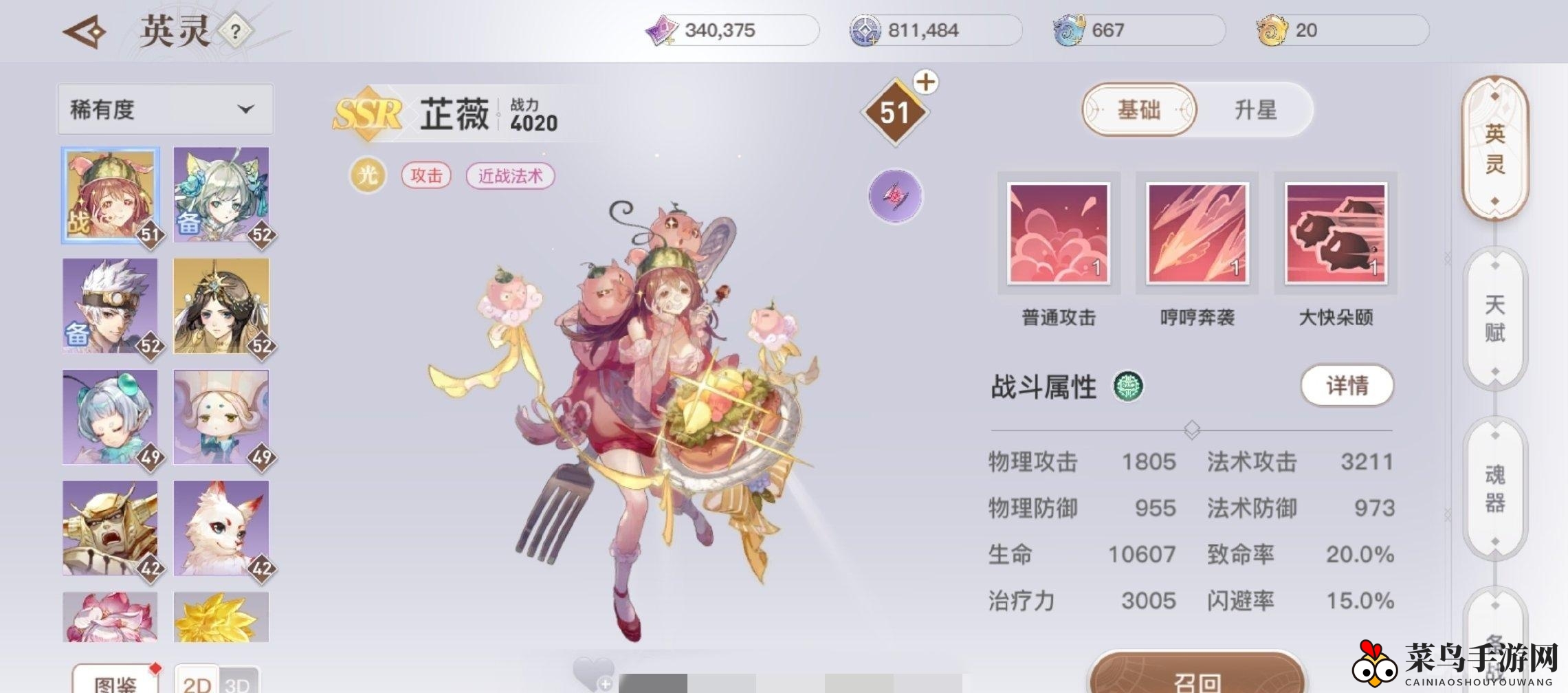 透过芷薇的数据面板,我们得以一窥这位擅长法术的近战英雄的强大之处。她不仅拥有丰厚的生命值以抵御伤害,其法术攻击力亦不容小觑。她掌握的技能——普通攻击、疾风奔袭与饕餮盛宴,均与她的人物特质完美契合。