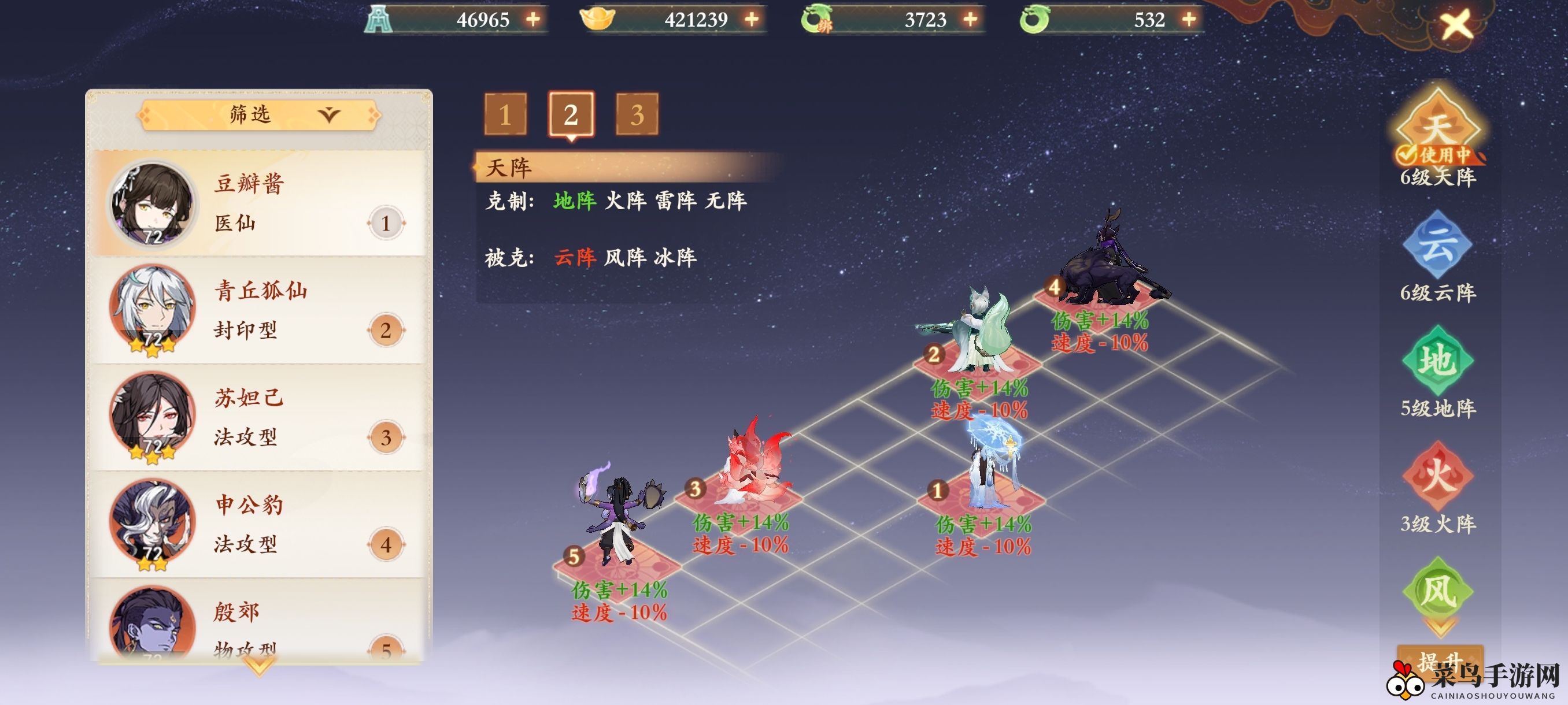2、阵法运用:天阵、火阵等实现三攻的阵法