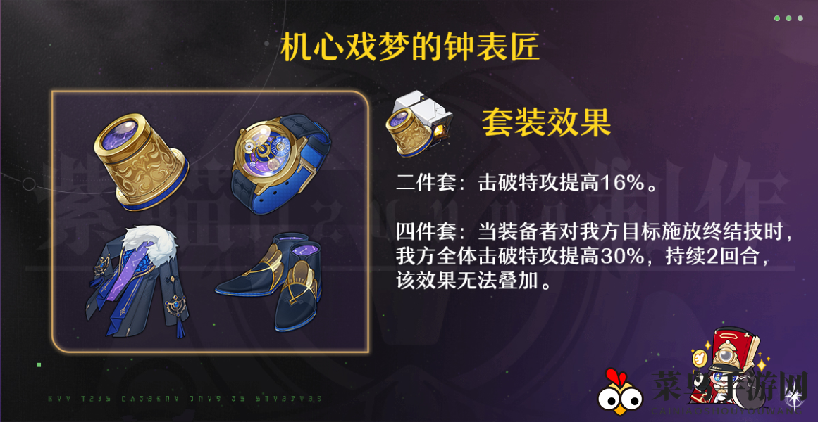 解析:此套装组合同样提供击破特攻,是过渡期的理想选择。若追求机心四件套,建议继续使用四件套。