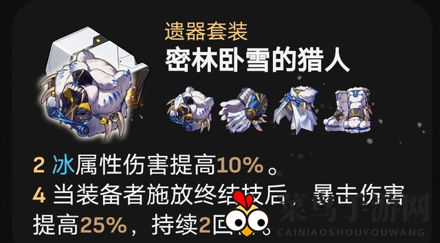 作为冰系单体输出角色,彦卿的必备遗器非冰系四件套【密林卧雪的猎人】莫属,冰伤的提升与终结技后的爆伤增加,完美契合彦卿的属性。