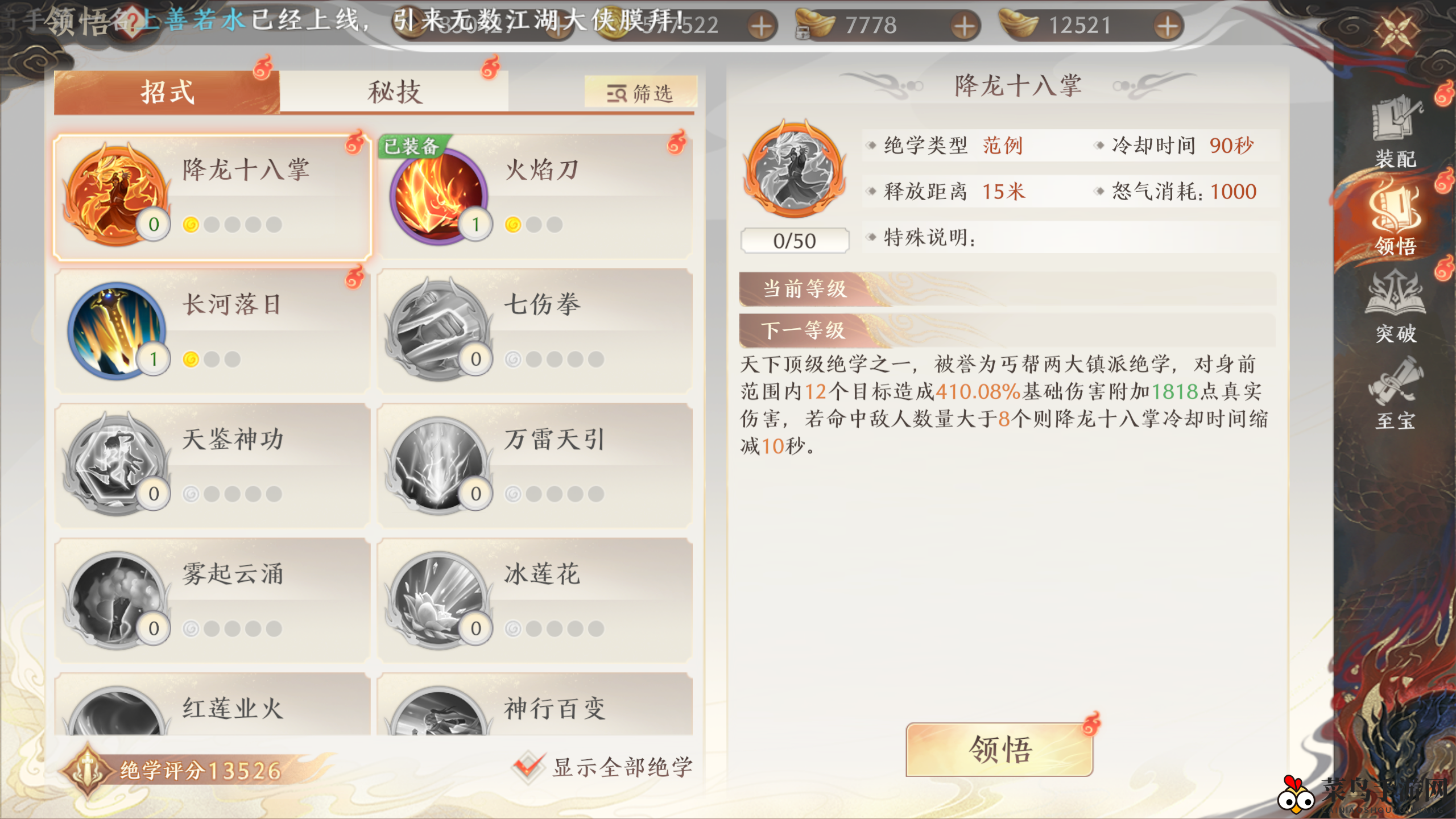 通过【菜单】-【绝学】,查看并装配已解锁的绝学。