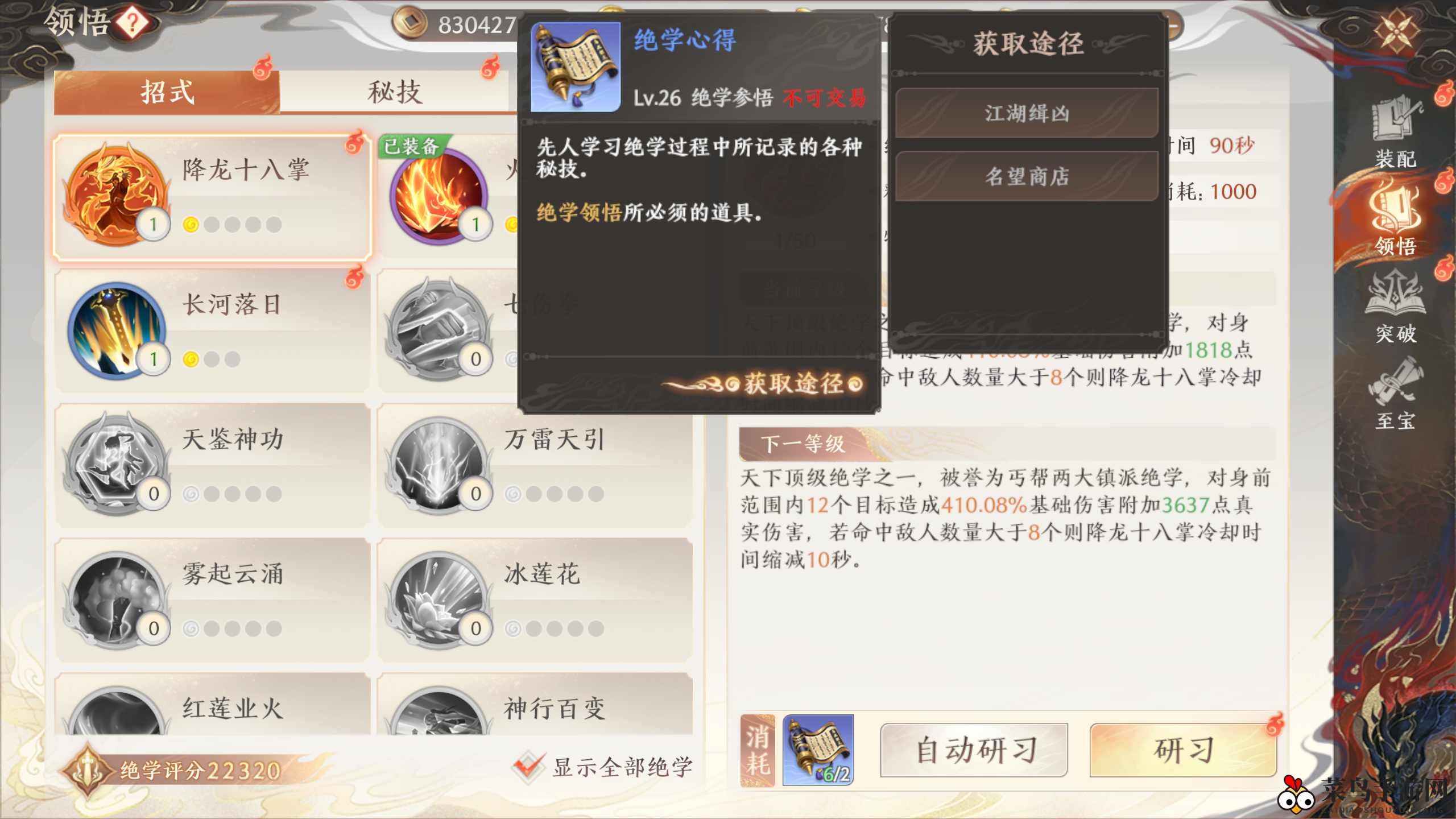 【修炼】绝学需消耗【绝学修炼心得】,可通过【江湖追捕】与【声望商店】获取。