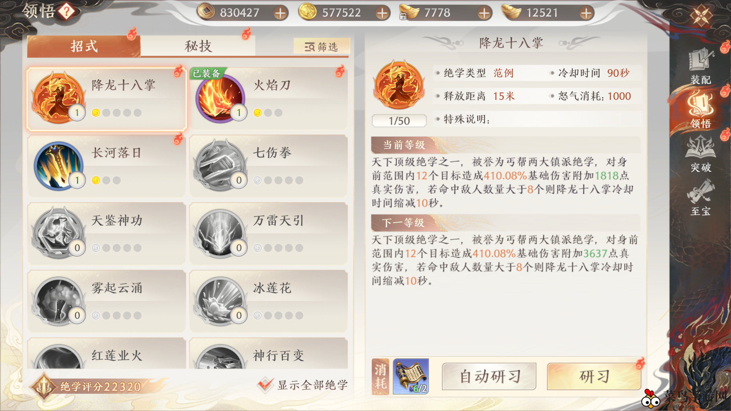 自动修炼功能可快速提升绝学等级,并预览下一等级效果。