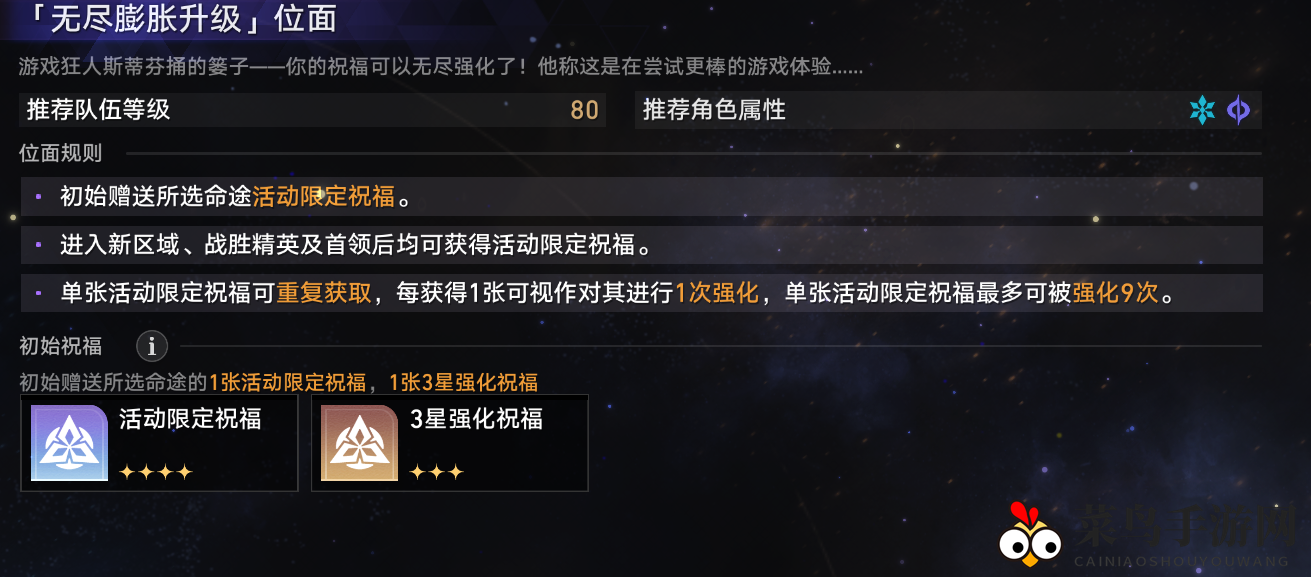 8个限定祝福、2个三星祝福、13个普通祝福(极大概率出现三星祝福)、两次商店强化机会。