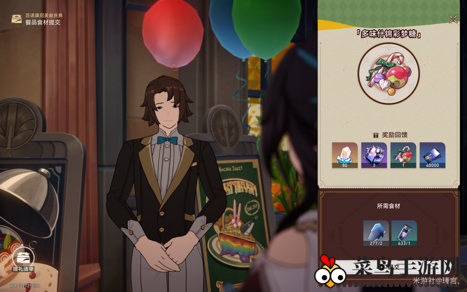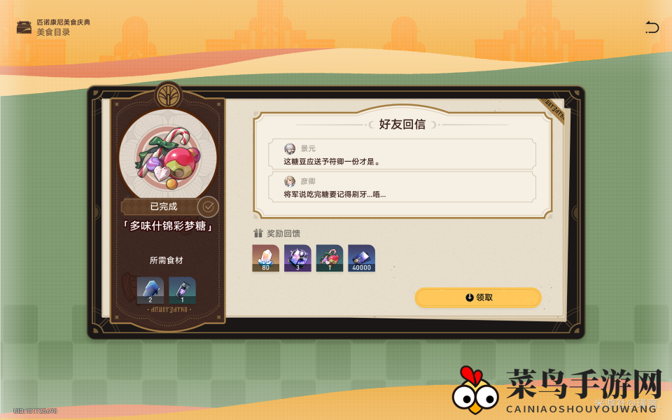 提交食材后,你将获得80星琼、3个漫游指南(角色升级必备)、1个「彩梦」什锦糖果(听起来就让人垂涎)以及40000信用点。这样,第七天的美食“多味什锦彩梦糖”就成功制作完成了!
