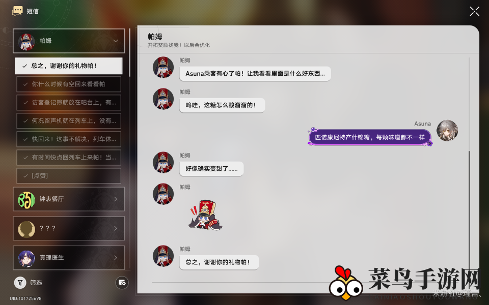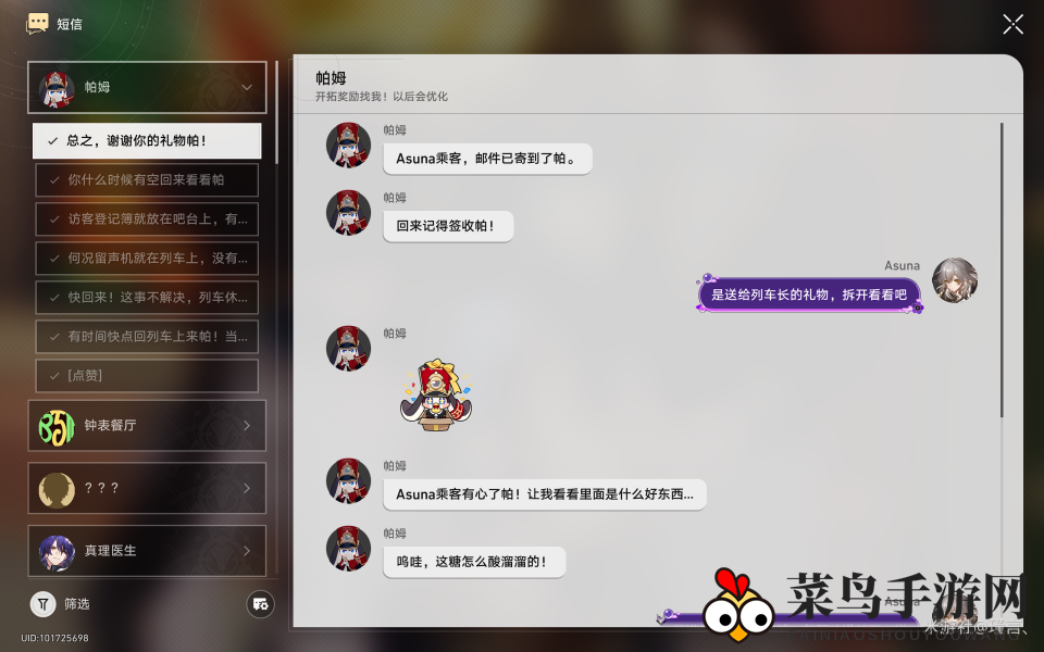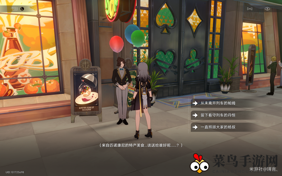 你打算送给谁呢?我选择了帕姆,因为帕姆不能离开列车独自守候空车,这份礼物就是对空巢帕姆的一份关爱。选择帕姆后,会触发与帕姆的对话,这就是星穹列车大家庭的温暖,让人感到温馨。