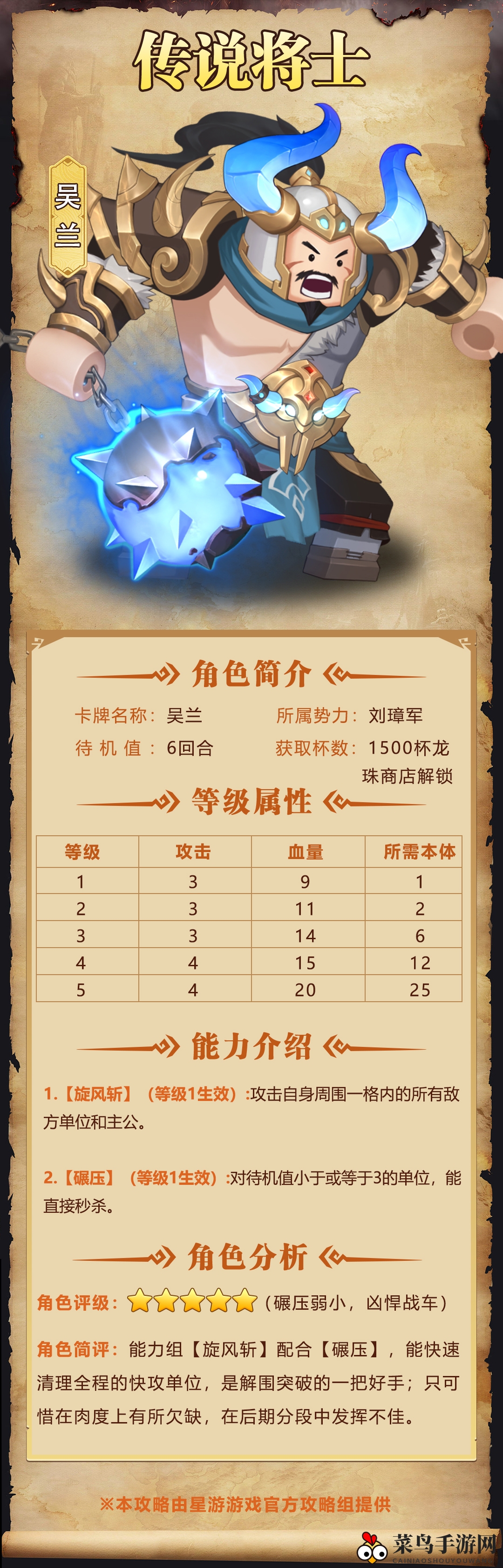 角色点评:吴兰的技能[旋风斩]与[碾压]协同,犹如狂风暴雨,瞬间摧毁敌方快速攻击阵容,成为战场扭转乾坤、突破敌阵的关键力量;然而,他的生存能力相对较弱,这可能是他后期表现不如预期的关键因素。