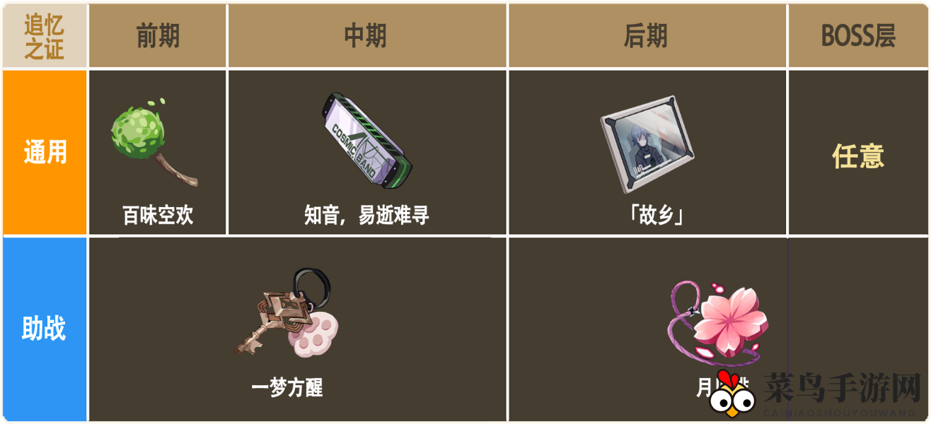 ①通用证:初期携带百味空欢,后解锁空梦一核心,换为知音、易逝难寻,最终boss层自由选择。