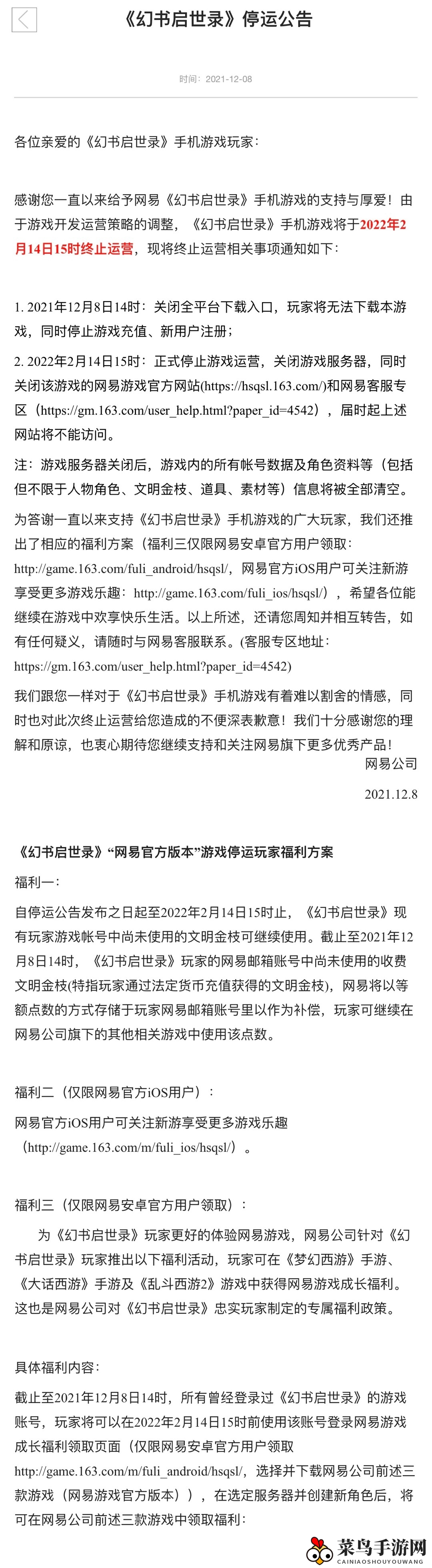 公告透露,自2021年12月8日14时起,游戏将关闭下载通道,停止充值及新用户注册;2022年2月14日15时,游戏运营将正式结束,服务器将关闭。