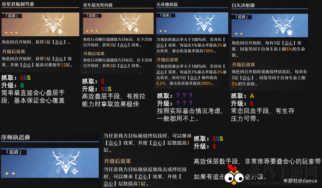 会心能够在未受击时提供大量双爆,十分契合巡猎流派连动的特点。但是十分容易掉层,需要额外注意。