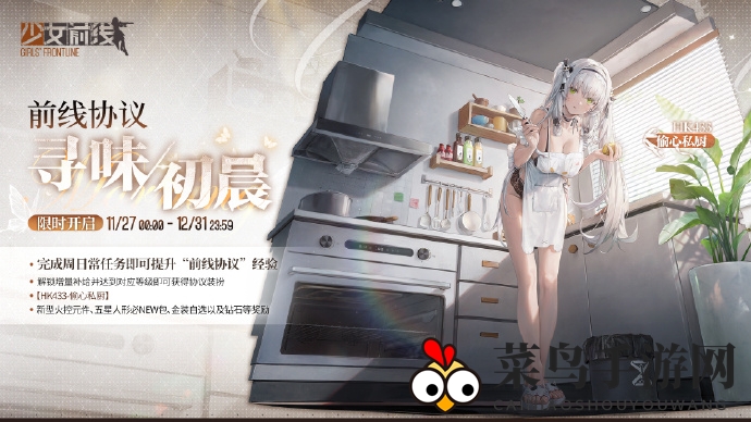 第十四期前线协议寻味初晨活动,将于11月27日0:00至12月31日23:59限时开启。参与周日常任务,轻松提升前线协议经验,解锁增量补给,升级至相应等级,即可获得HK433偷心私厨等丰富奖励。