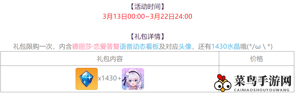 《崩坏2》白色情人节限时礼包活动介绍完毕,更多精彩攻略,敬请关注手游网!
