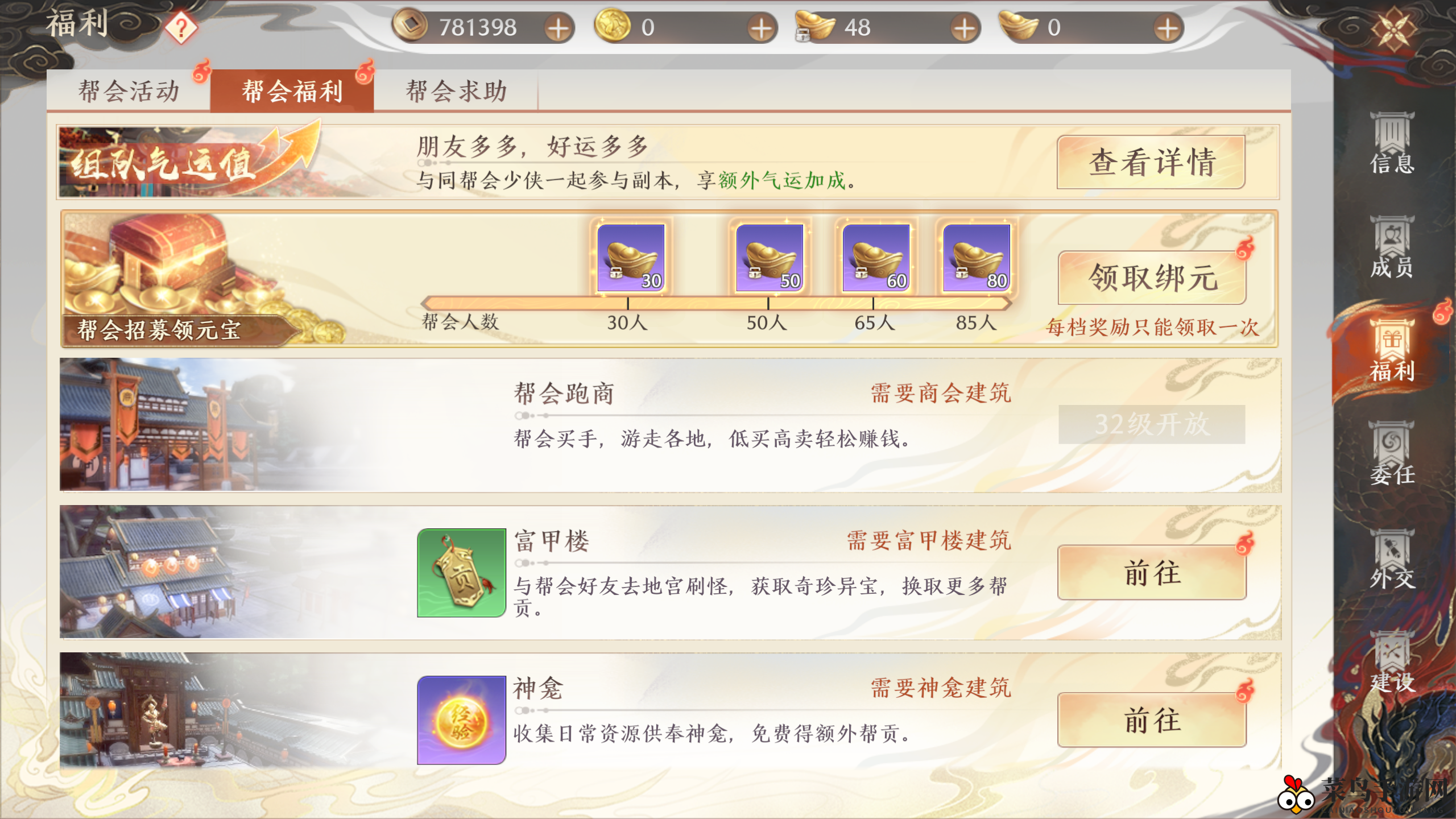 2)帮会招募领元宝:帮会招募人数达标,绑定元宝任你拿。