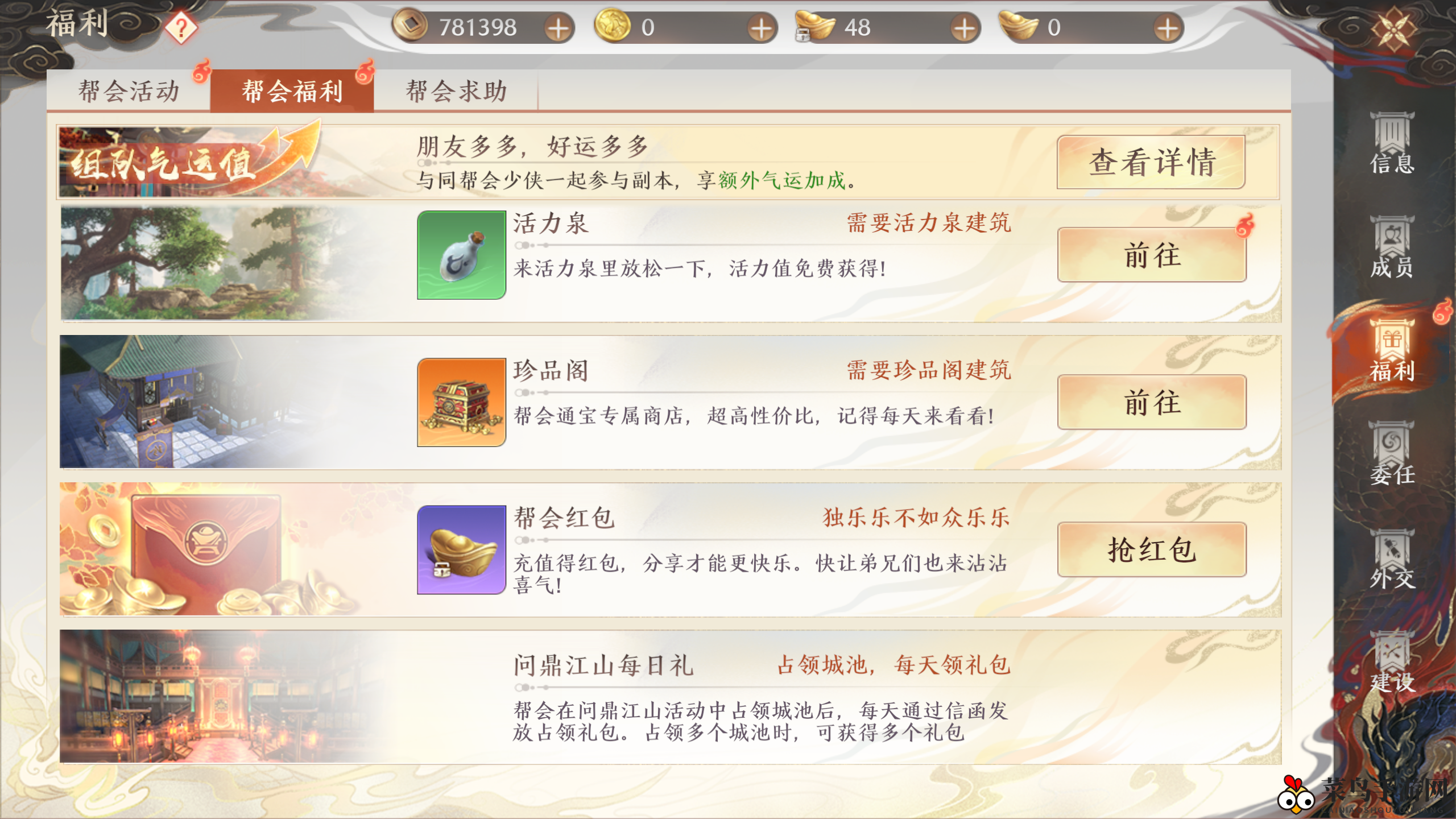 更有演武场、许愿树、战旗处、活力泉、珍品阁、帮会红包、问鼎江山每日礼等福利,等你来发掘。
