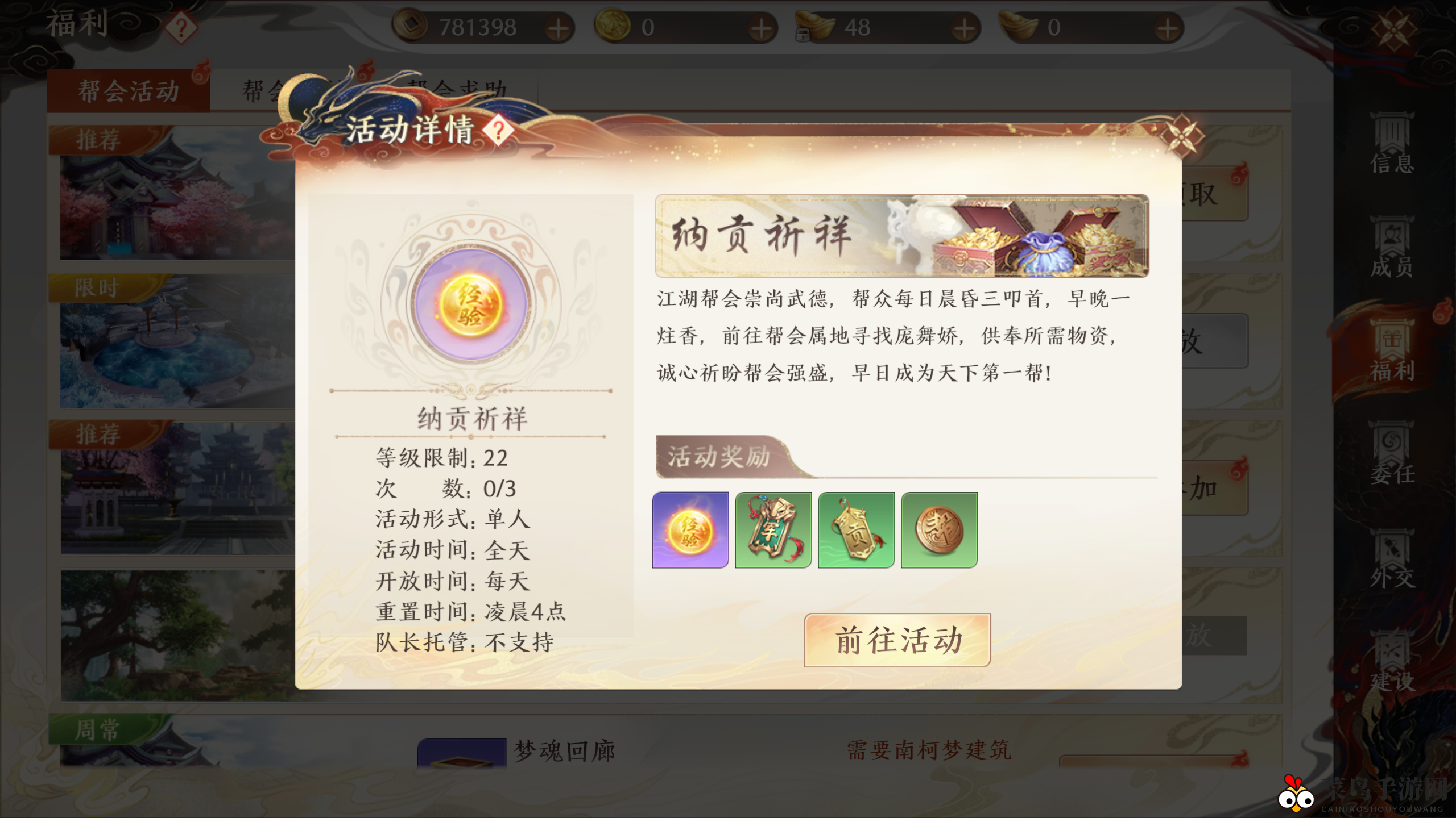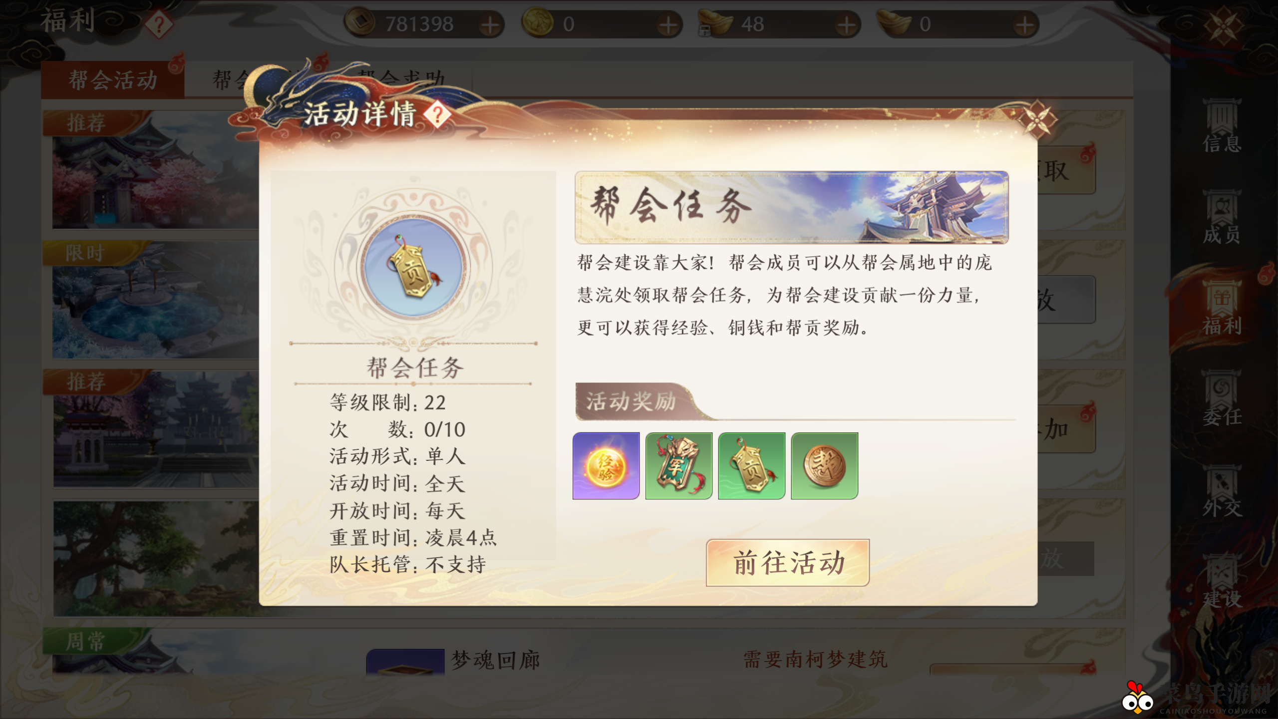 还有梦魂回廊、问鼎江山、帮会运镖、饭馆经营等多种活动,等你来解锁更多奖励。