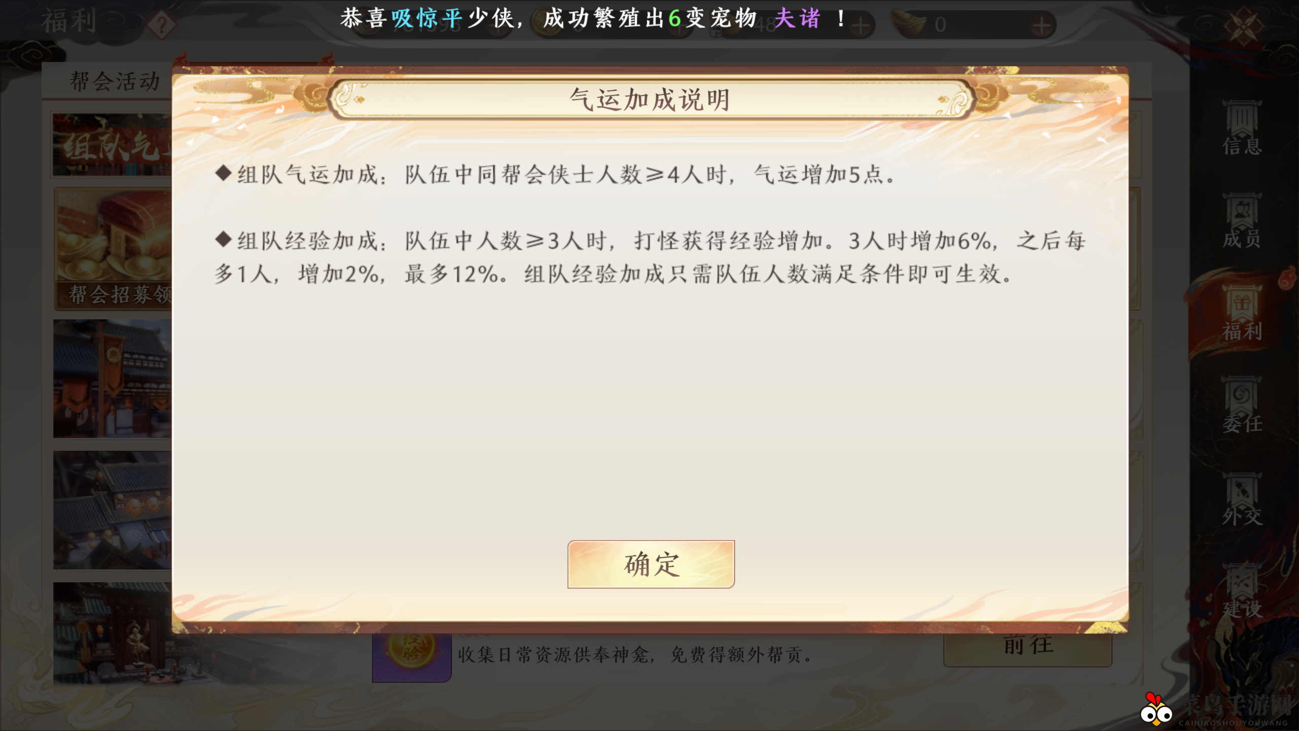 1)组队气运值:与帮会伙伴组队,气运加成和经验翻倍。