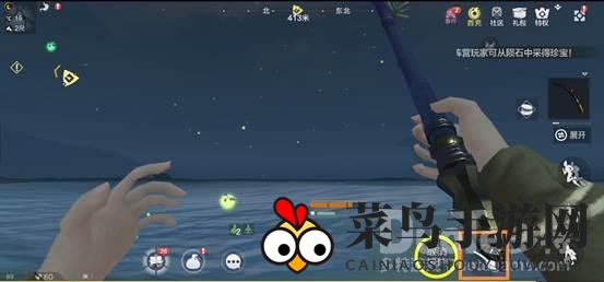 装备好钓鱼竿,前往海边、河边、湖边等水域进行垂钓。先将鱼竿放入快捷栏,拿起它,就像操作玩具一样,钓鱼竿会自动展开进入第一视角。点击右下角的橙色按钮,即可抛出鱼竿。