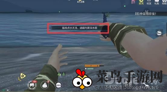 若瞄准点显示“水太浅”,请调整视角向上,注视远处的深水区域,再抛出鱼竿。