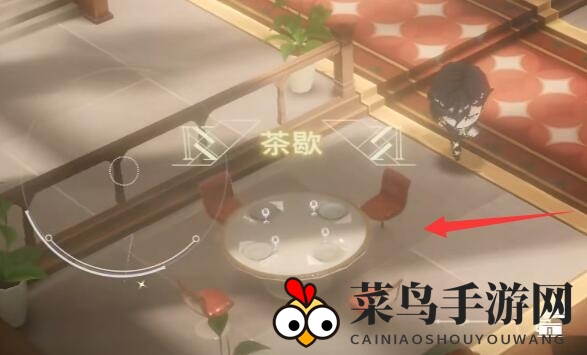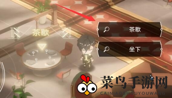 2、靠近餐桌,系统提示会自动弹出,记得点击“茶歇”按钮(直接坐下是无效的)。