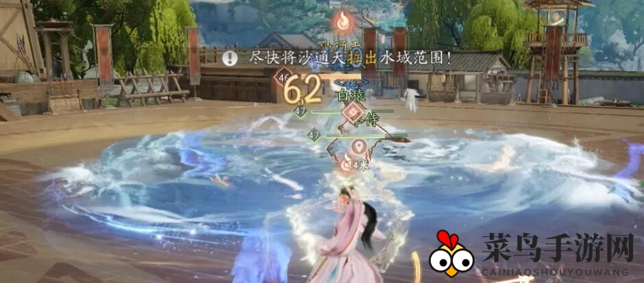 当沙通天boss释放脚下红色大范围攻击时,玩家需迅速躲避,随后由治疗职业引导boss离开波浪区域,轻松化解这一波攻势。