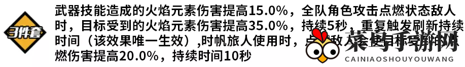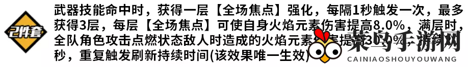 二件套赋予自身火伤,层数叠满时为全队提升火伤。启动条件为武器技命中三次,存在触发间隔,需约三秒启动。在当前火辅中,爱衣能稳定触发。全队火伤提升仅对点燃状态的敌人有效,非常适合点燃能力强的爱衣。