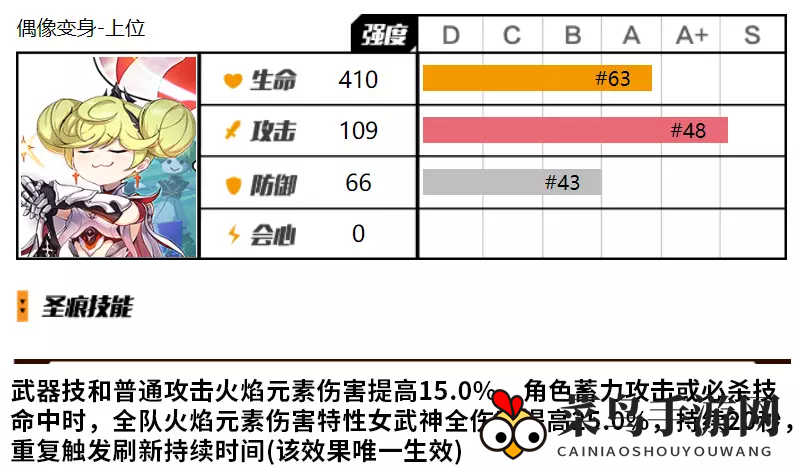 该部位提供无条件全伤加成,并在武器技或必杀命中后提升全队火伤。持续时间长,触发条件宽松,但加成幅度在高端圣痕中略显不足。