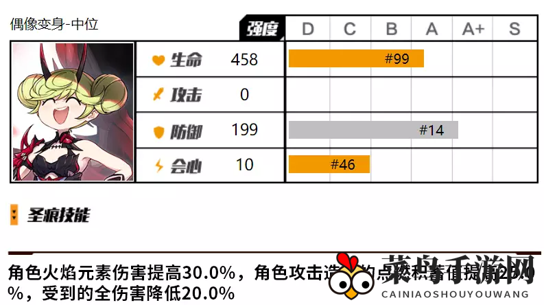 中位提供无条件火伤加成和点燃积蓄值提升,具备一定功能性,在对抗需点燃异常的敌人时效果显著。数值加成适中,价值在于提升点燃积蓄值。