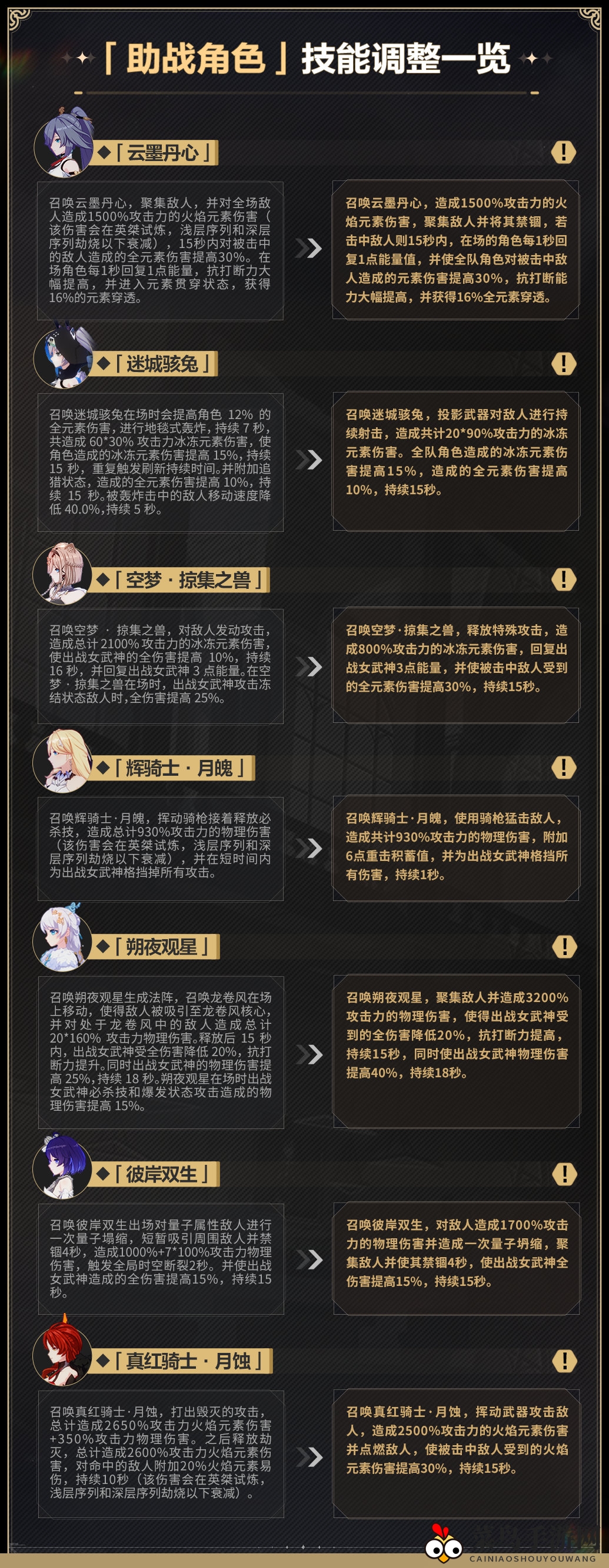 「云墨丹心」、「迷城骇兔」、「空梦·掠集之兽」、「辉骑士·月魄」、「朔夜观星」、「彼岸双生」、「真红骑士·月蚀」的助战技能与战斗表现将进行调整,详情请查阅下方图片~