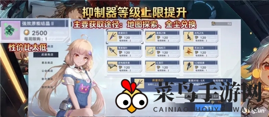提升抑制器等级,除了原有材料,还需维拉产出的新型进阶材料。目前,获取途径仅限于金尘与探索进度,渠道有限。金尘兑换价高达2500,提升幅度有限。多数情况下,高等级抑制器带来的优势更为显著。期待官方拓展获取途径,提升进阶材料性价比。