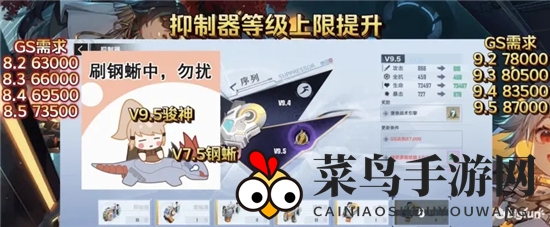 当抑制器等级升至9.5,等级上限升至80级。在8.5级时,玩家能获得西萝意志,而9.5级最高级抑制器有机会随机获得金引擎。依据钢蜥俊神理论,7.5级将孕育新钢蜥,9.5级则是我们的俊神极致。但欲达9.5级抑制器巅峰,所需战力达8.7万,新装备属性加成更显关键。