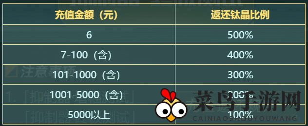 “增幅测试”6元部分,返还6*500%*10=300钛晶,